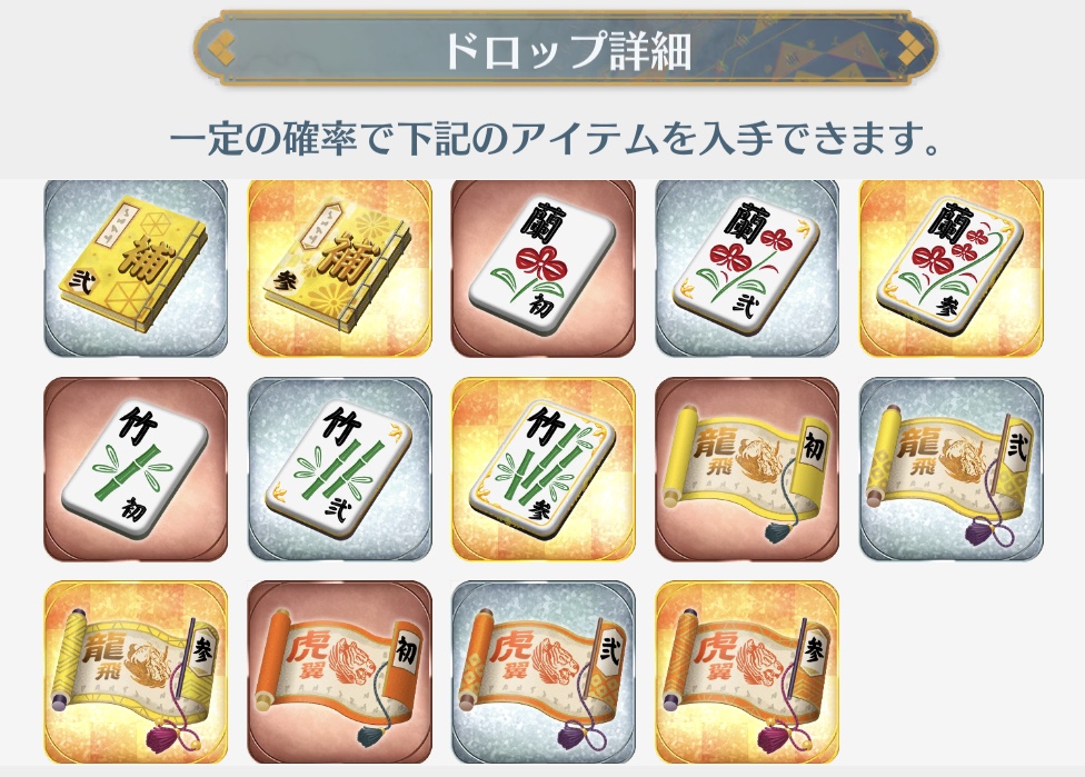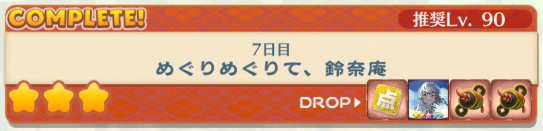 | 1日目 免許皆伝?小鈴の新たなる試練 (vs紫。1wave戦) | 巻物 …風&雲 華片 …梅&菊 指南書…攻&防 | 20 | 30 | 50 |