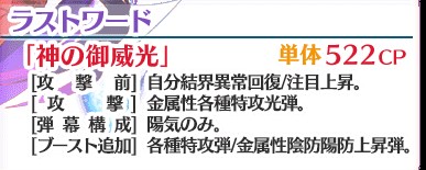 | 神のオーラ | 自身の注目を1段階アップ(3T) 自身の結界を1枚増加 | 自身の注目を3段階アップ(3T) 自身の結界を1枚増加 |