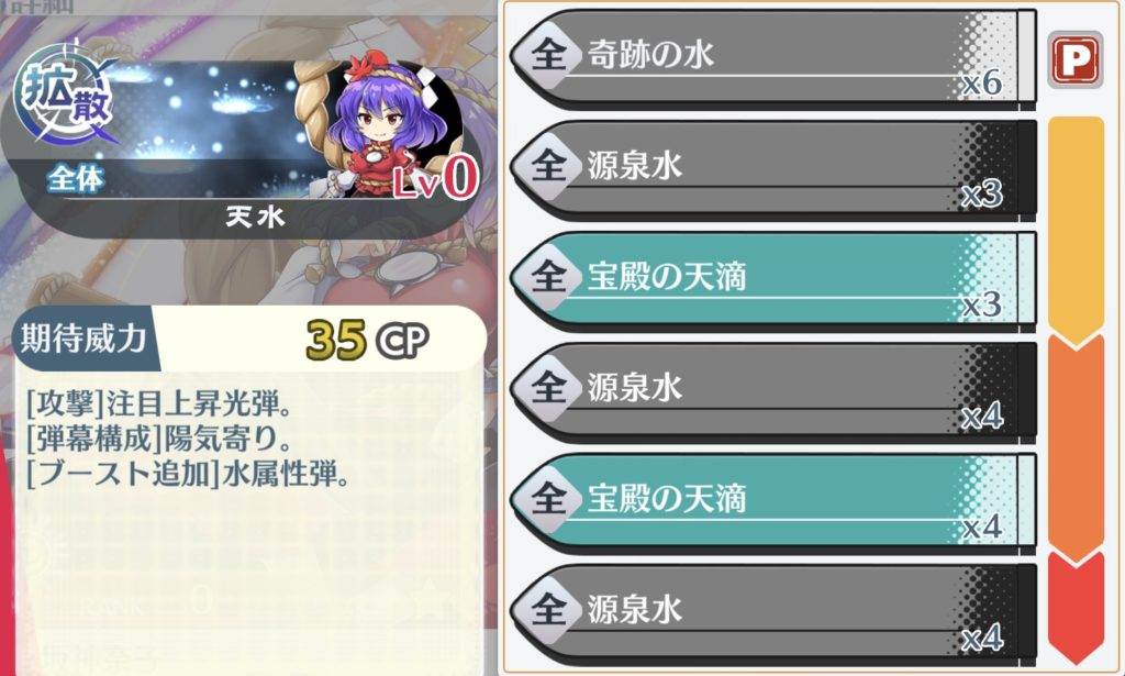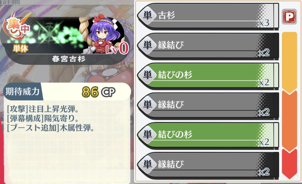 単体ラスワで幽々子と競っているようでは話にならん…というのが正直な所ですが、『人間特攻』なんかが刺さると取り敢えずそこと遜色無いレベルにはなり、更に『陽攻4段階~10段階』と大きなセットアップの余地も残せる程度になりました。