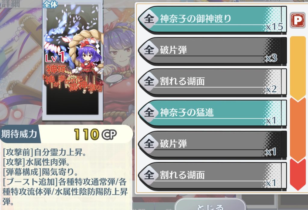 『アタッカーとして優秀』とはお世辞にも言えませんが、陰陽バラツキが多い初期キャラとしては陽気オンリーで命中率も100%ではないのでセットアップもしやすく、『神奈子を好きな人が頑張れば使える』くらいの余地は何とか生まれた感じでしょうか。